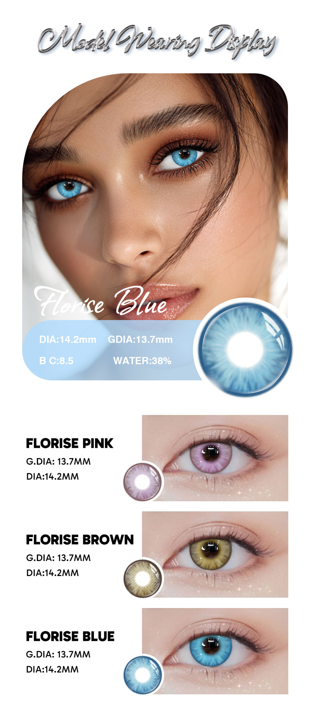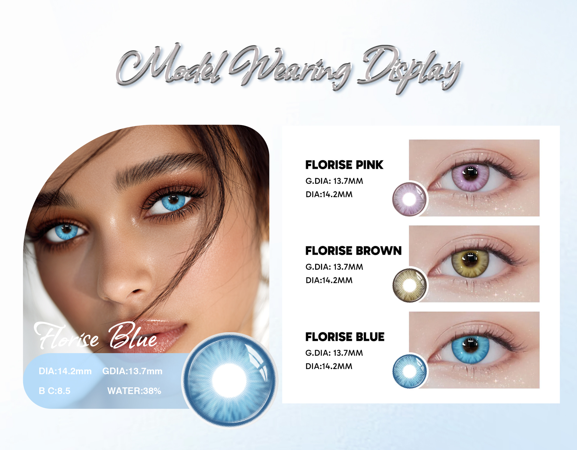 Florise Blue contact lenses combine comfort, style, and quality. With a 1-year lifespan and 2 lenses per pack, they provide a natural, vibrant blue hue and all-day comfort.