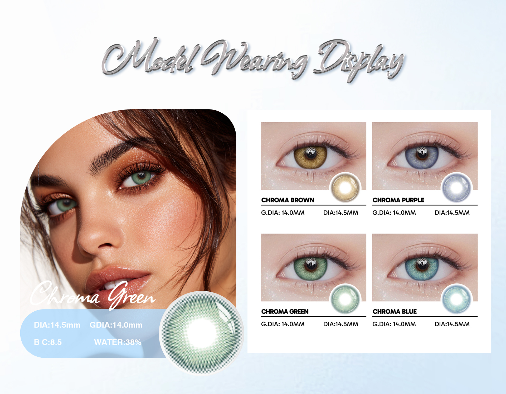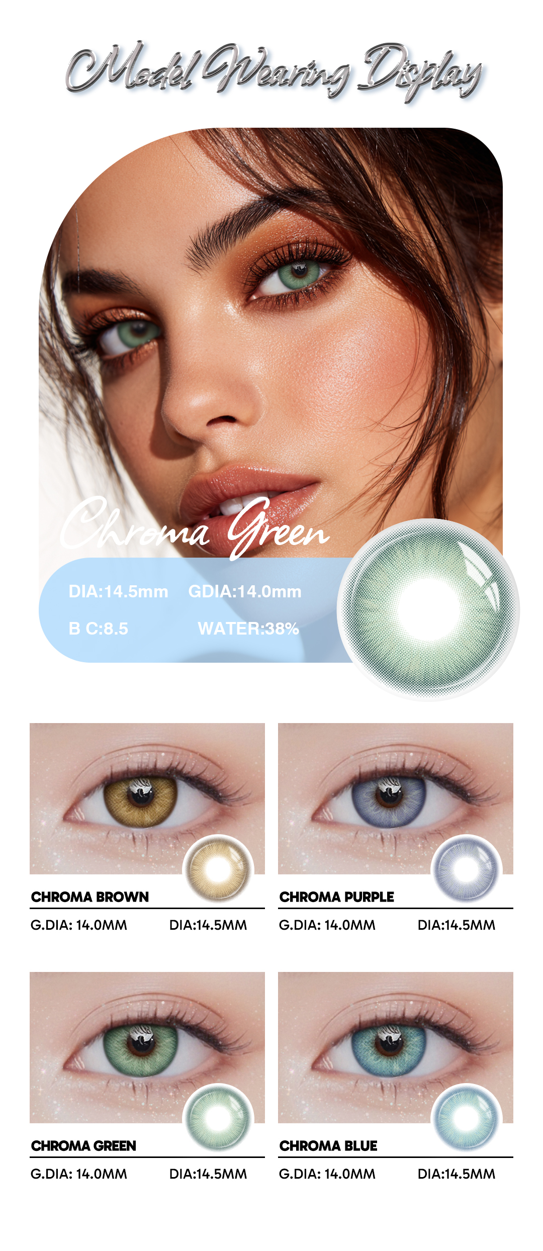 Enjoy long-lasting style with Chroma Green 1-Year Contact Lenses. These vibrant green lenses offer comfort, durability, and safety for both prescription and non-prescription wearers. FDA & CE certified with UV and blue light protection, each pack includes 2 lenses designed for a full year of use.