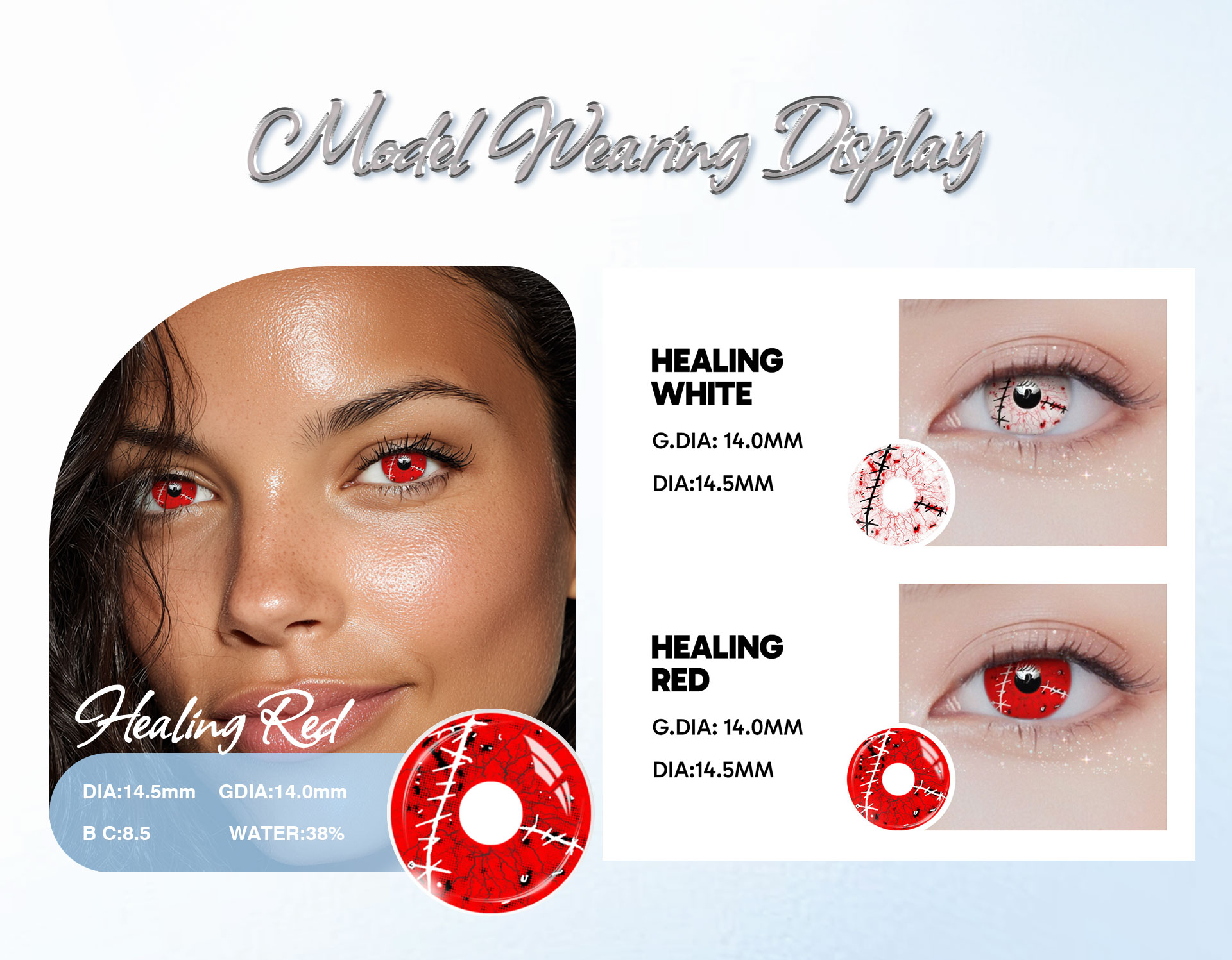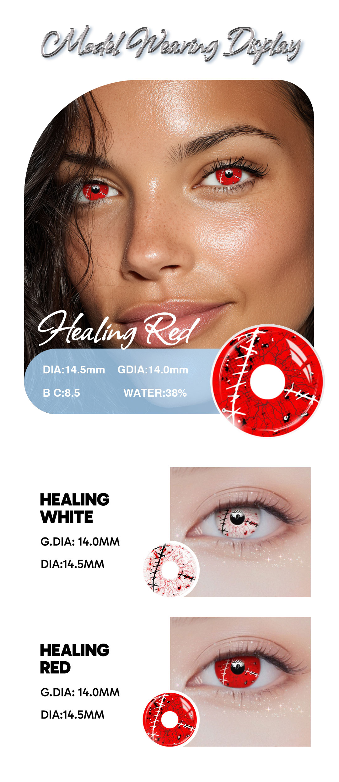 Healing Red 1-Year Contact Lenses give your eyes a vivid red hue. Comfortable for long wear, durable for a year, sold as a pair. Ideal for cosplay, fashion, or special events.