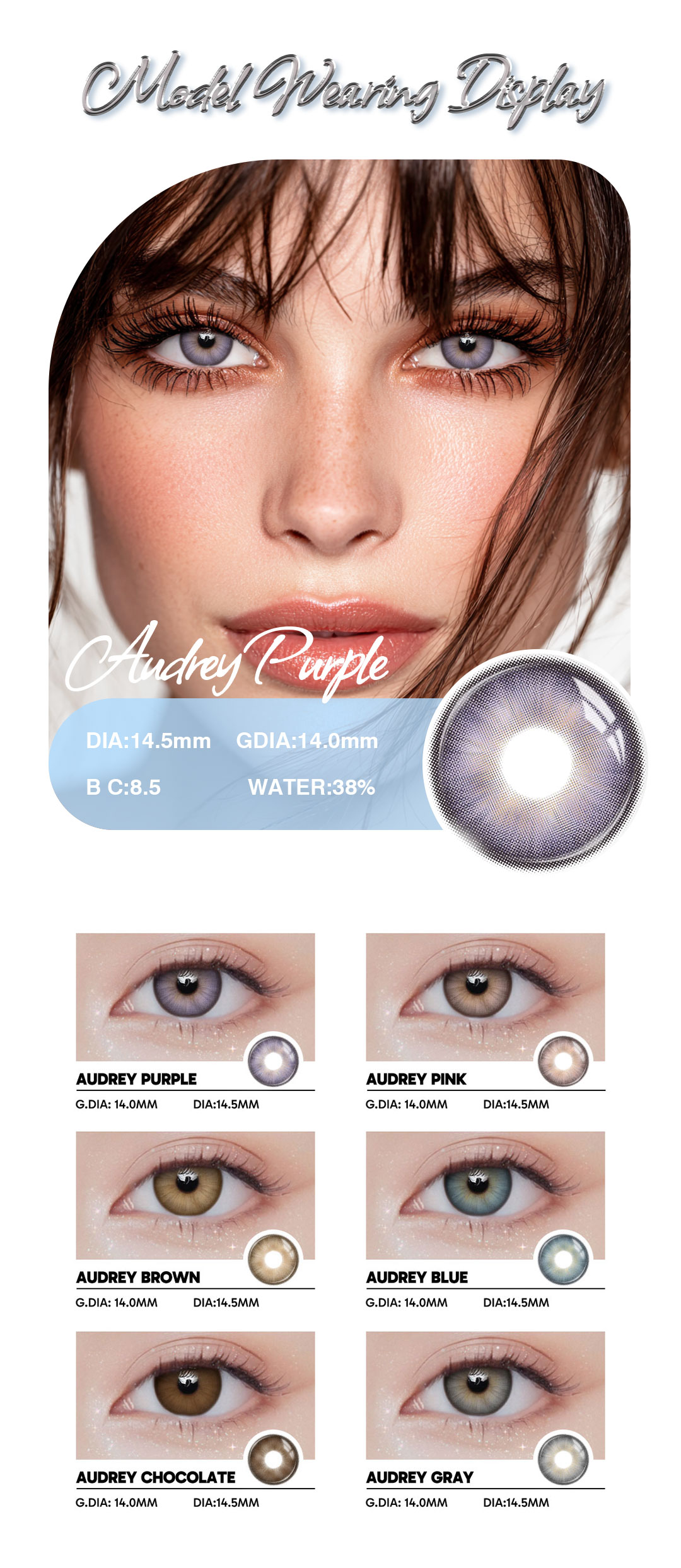 Audrey Purple – 1 Year, 2 Lenses offers a vibrant and elegant purple eye color with all-day comfort and a 12-month lifespan—perfect for fashion, photoshoots, and daily style enhancement.
