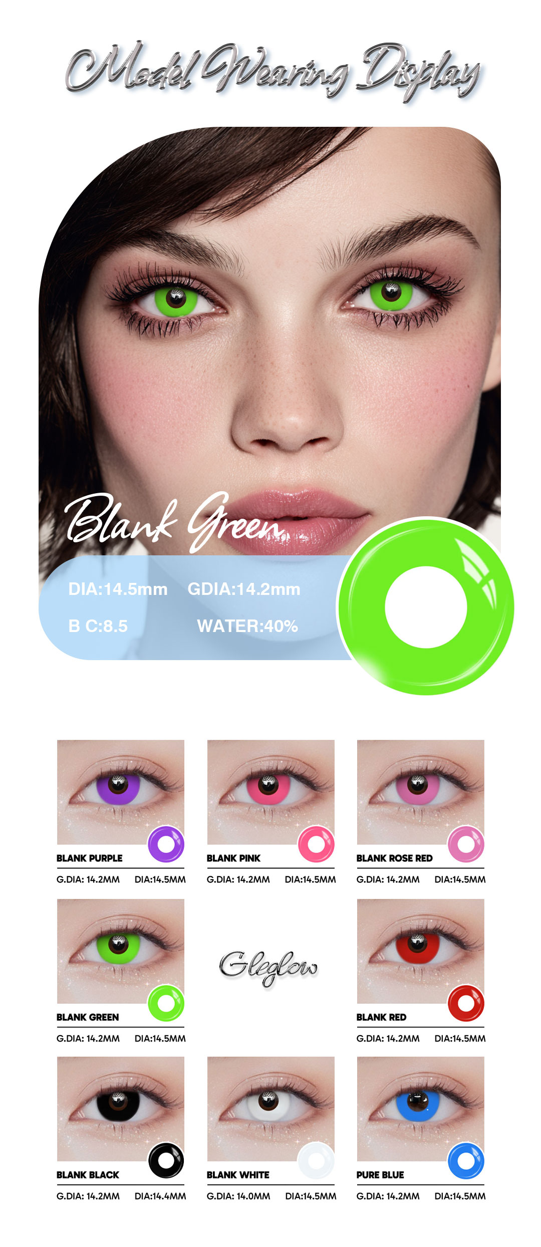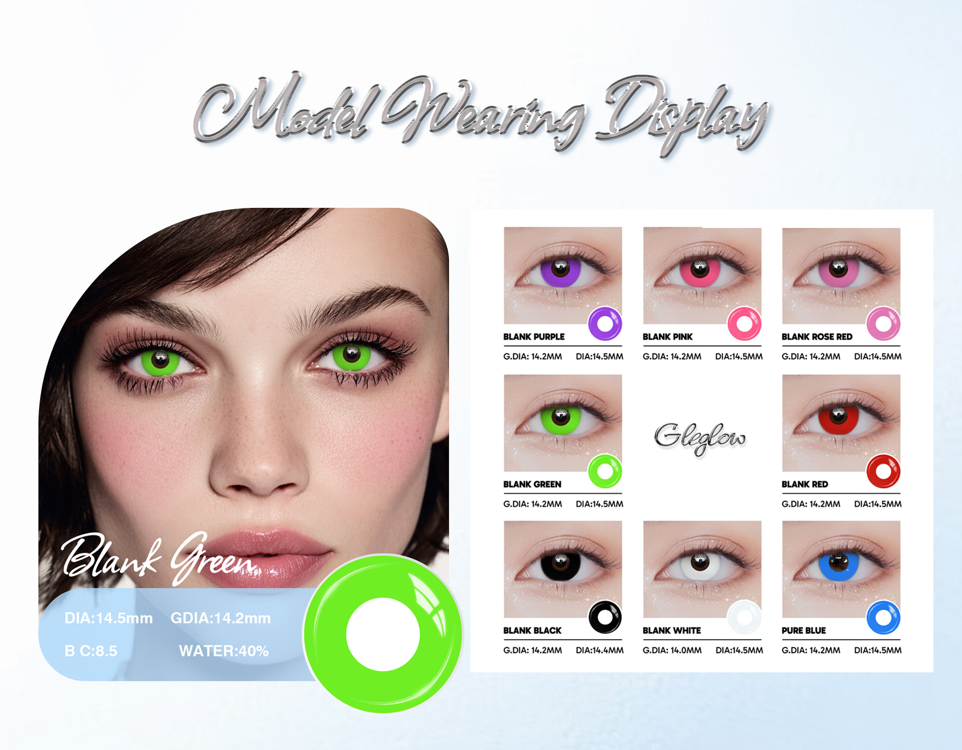 Enhance your eyes with Blank Green contact lenses. Soft, comfortable, and reusable for up to 1 year, this pair provides a subtle green tint for fashion, cosplay, or everyday style.