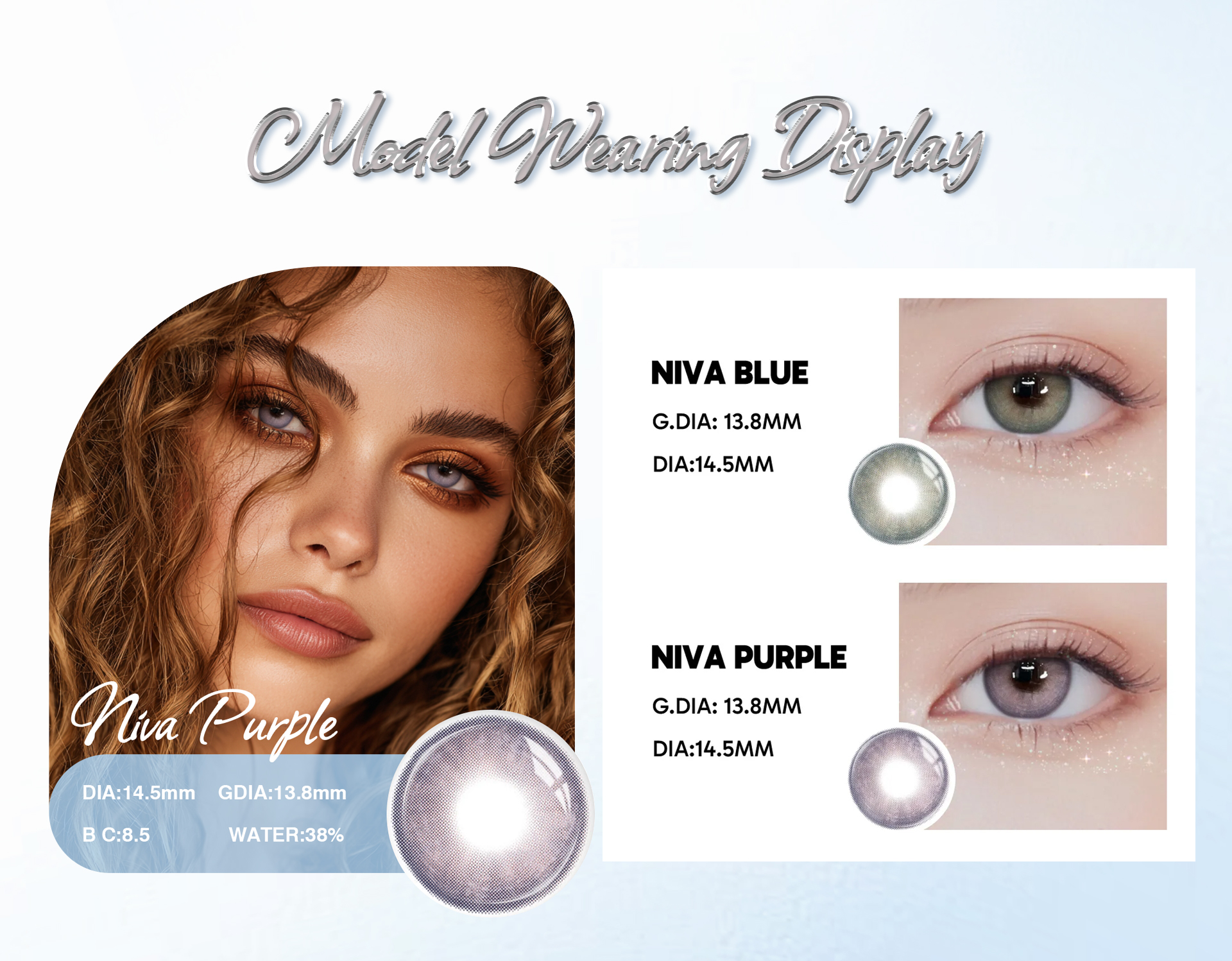 Niva Purple contact lenses offer a stunning and vibrant purple hue, designed for both style and comfort. Each pack contains 2 lenses suitable for up to 1 year of use. Ideal for transforming your look while maintaining eye safety and all-day comfort.