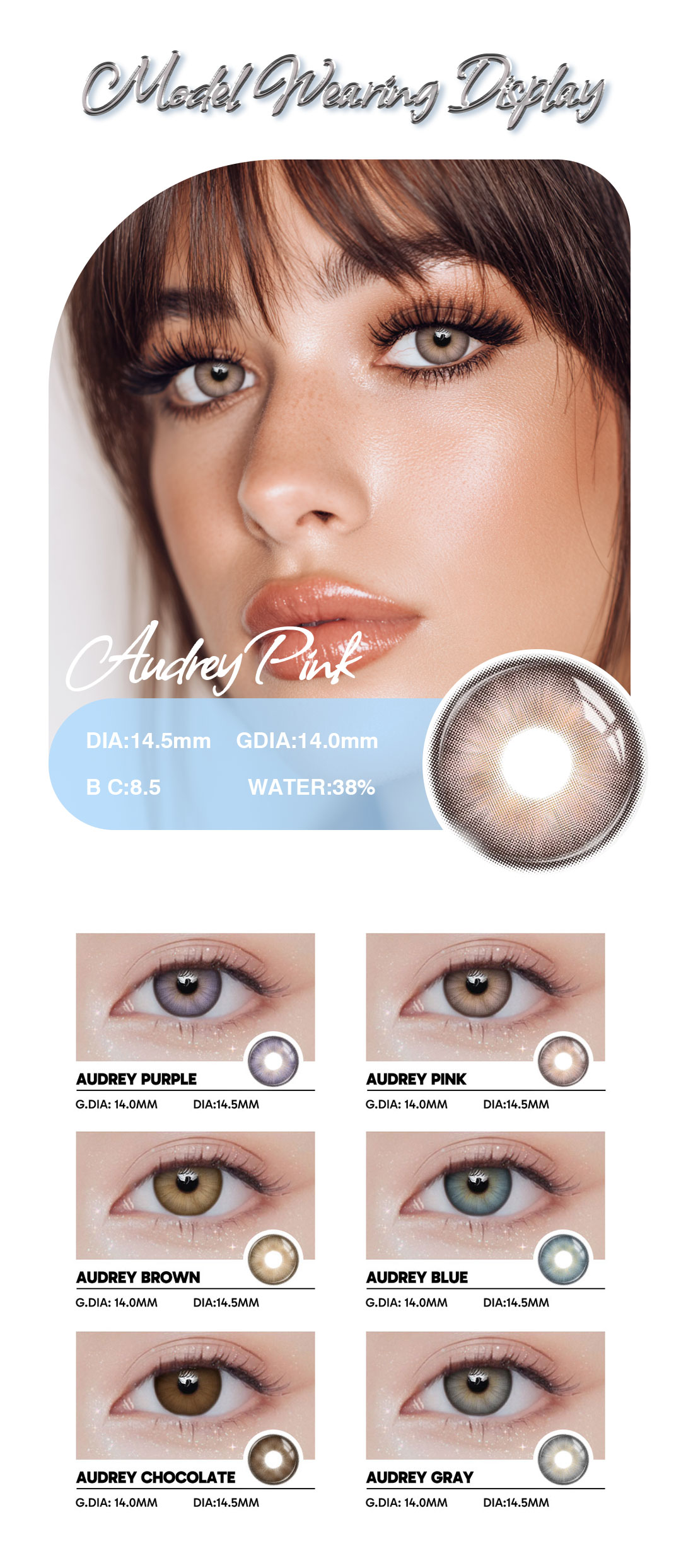 Audrey Pink 1-Year Contact Lenses are perfect for adding a soft pink tint to your eyes. Designed for comfort and long-lasting wear, this pack includes 2 lenses. Ideal for daily fashion or special occasions.