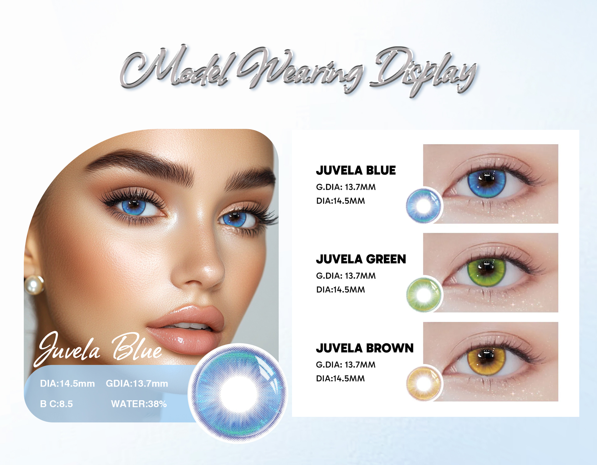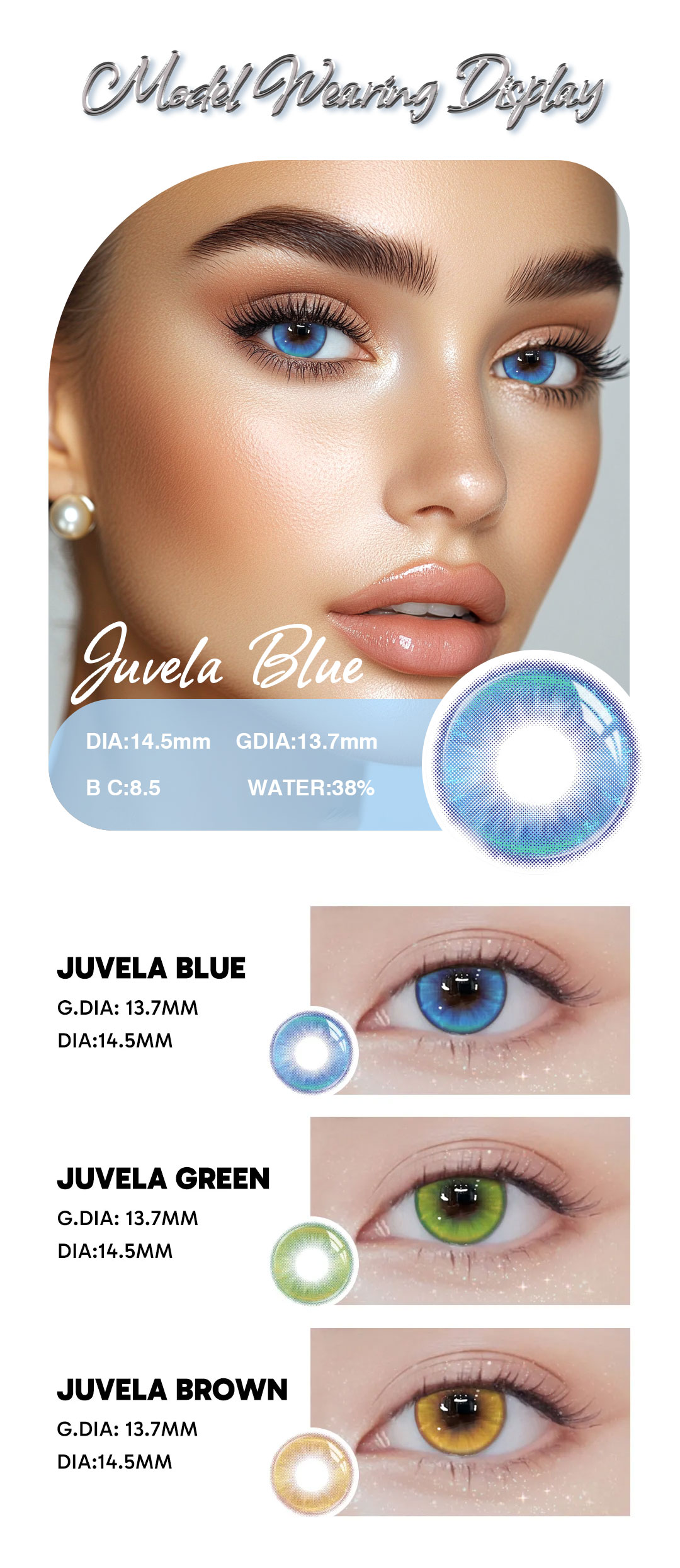 Juvela Blue 1-Year Contact Lenses offer a natural yet vibrant blue eye enhancement with superior comfort and clarity. With a 12-month lifespan, they provide lasting beauty perfect for daily wear or special occasions.