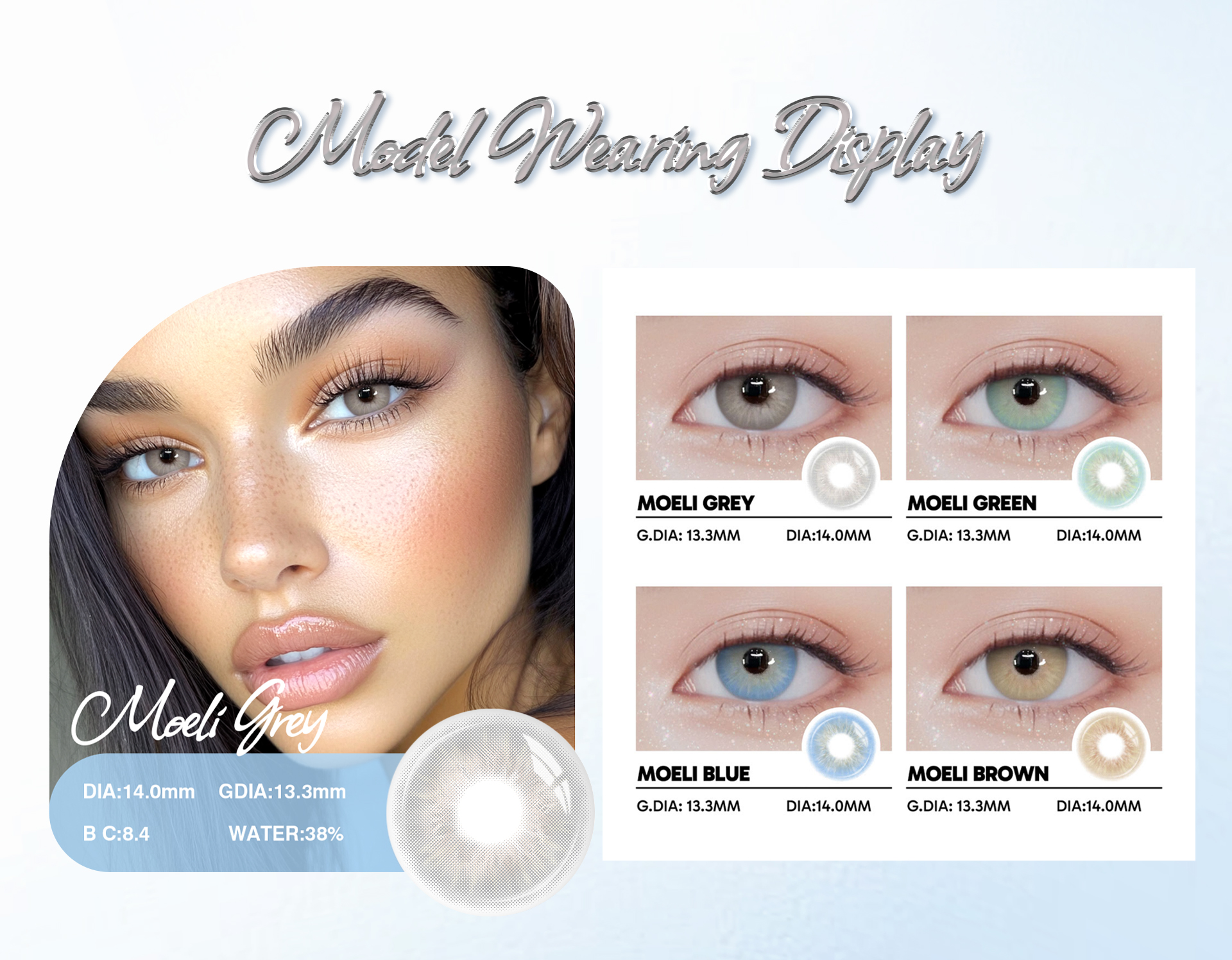 Achieve a sophisticated look with Moeli Grey contact lenses. Soft, comfortable, and reusable for up to 1 year, this pair adds a subtle grey tint, perfect for fashion, cosplay, or everyday style.