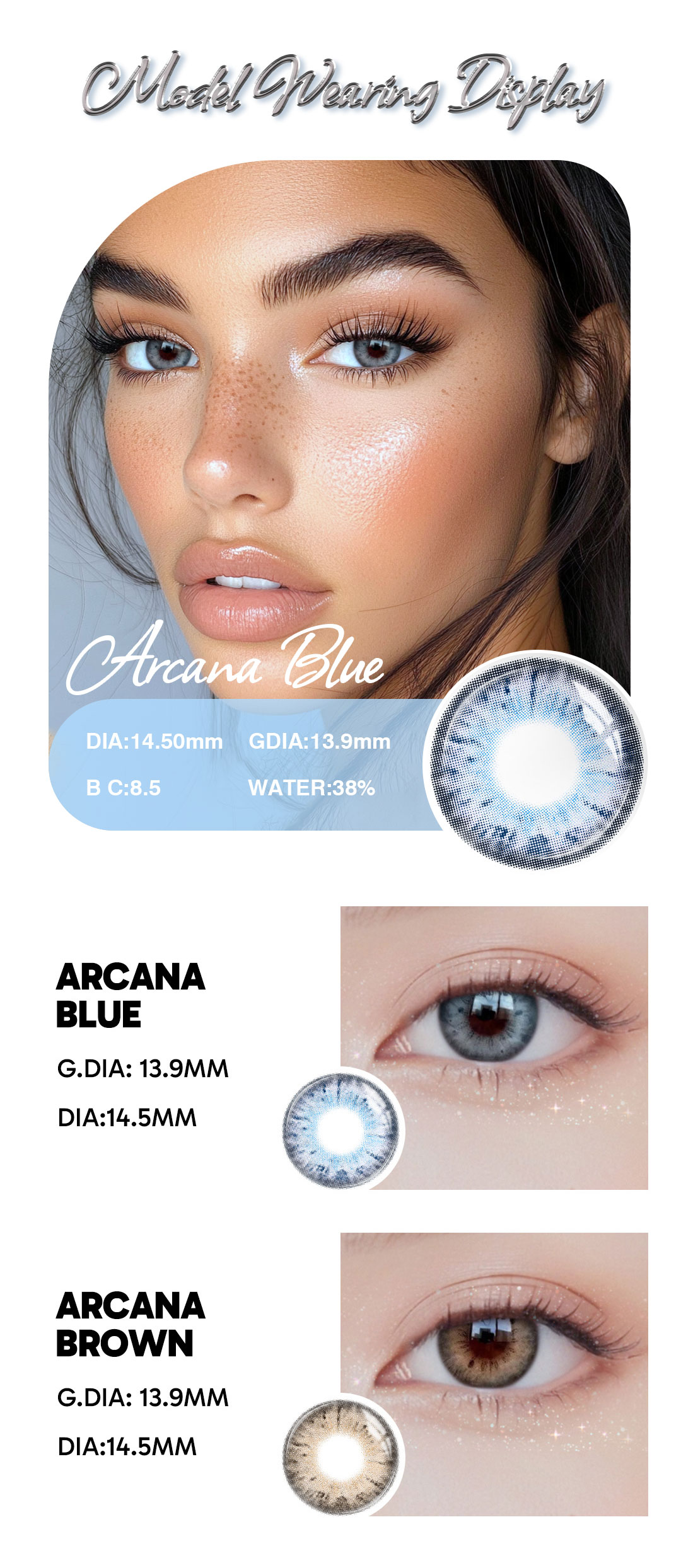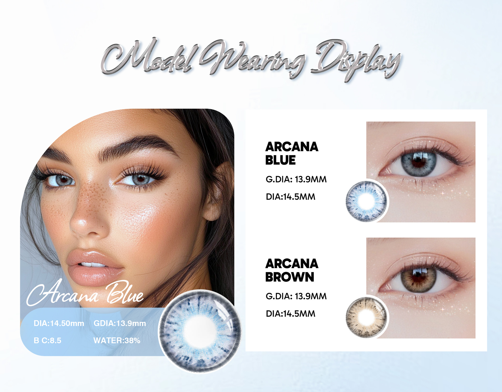 Arcana Blue 1-Year lenses deliver a natural, vibrant blue enhancement with all-day comfort and durability. Perfect for anyone seeking a striking yet realistic eye color that lasts all year.