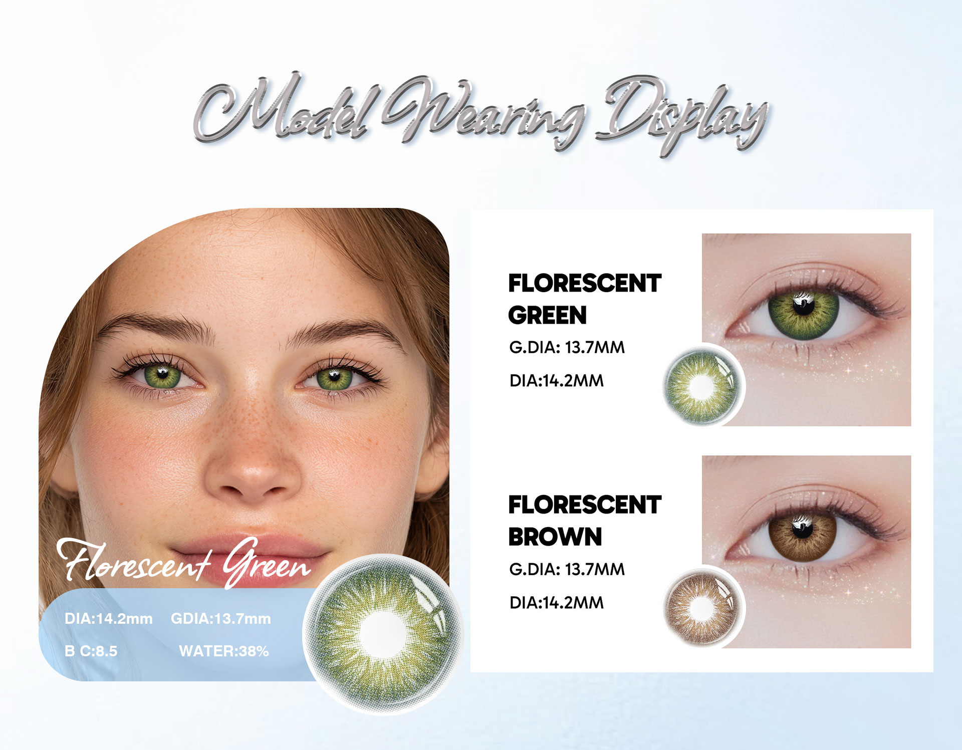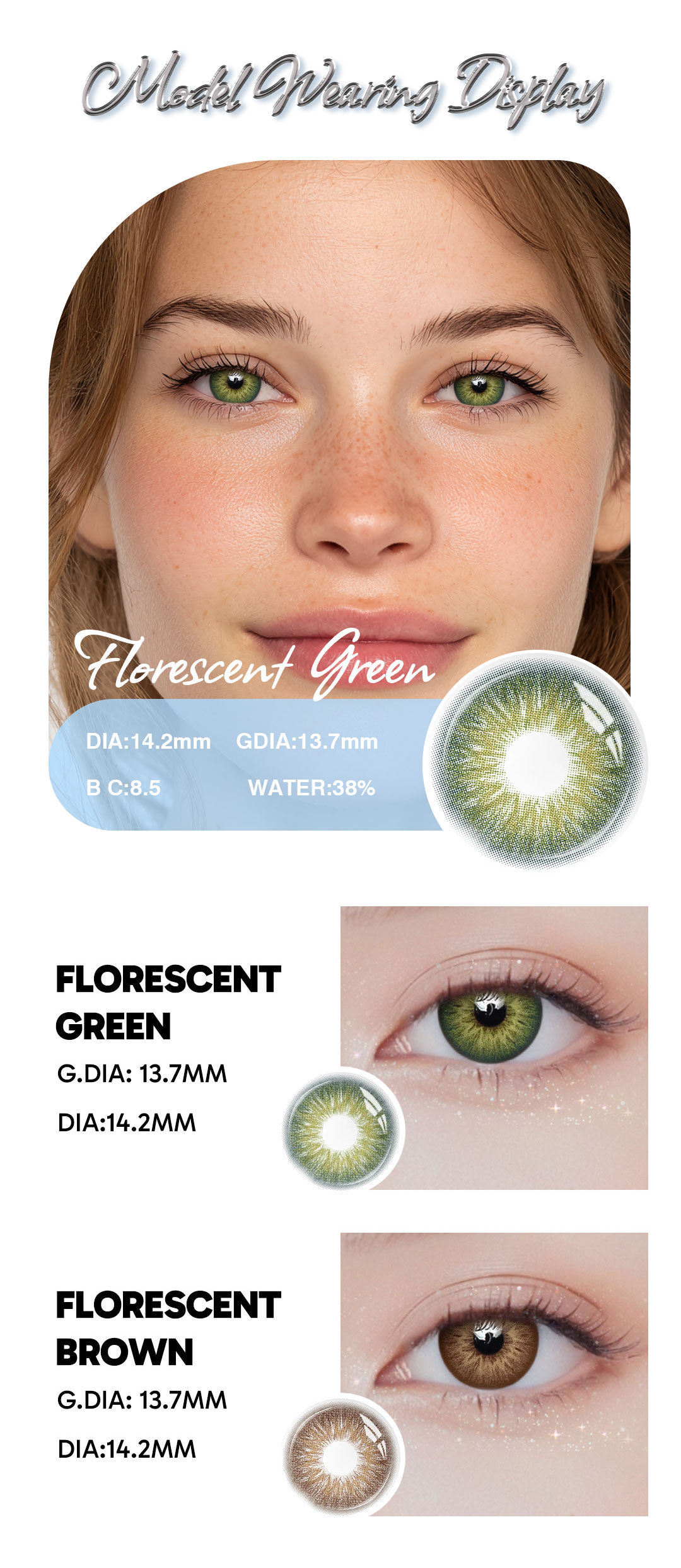 Florescent Green contact lenses – 1-year wear, FDA & CE certified, 14.2mm, Polyhema, prescription & non-prescription options, with UV and blue light protection.