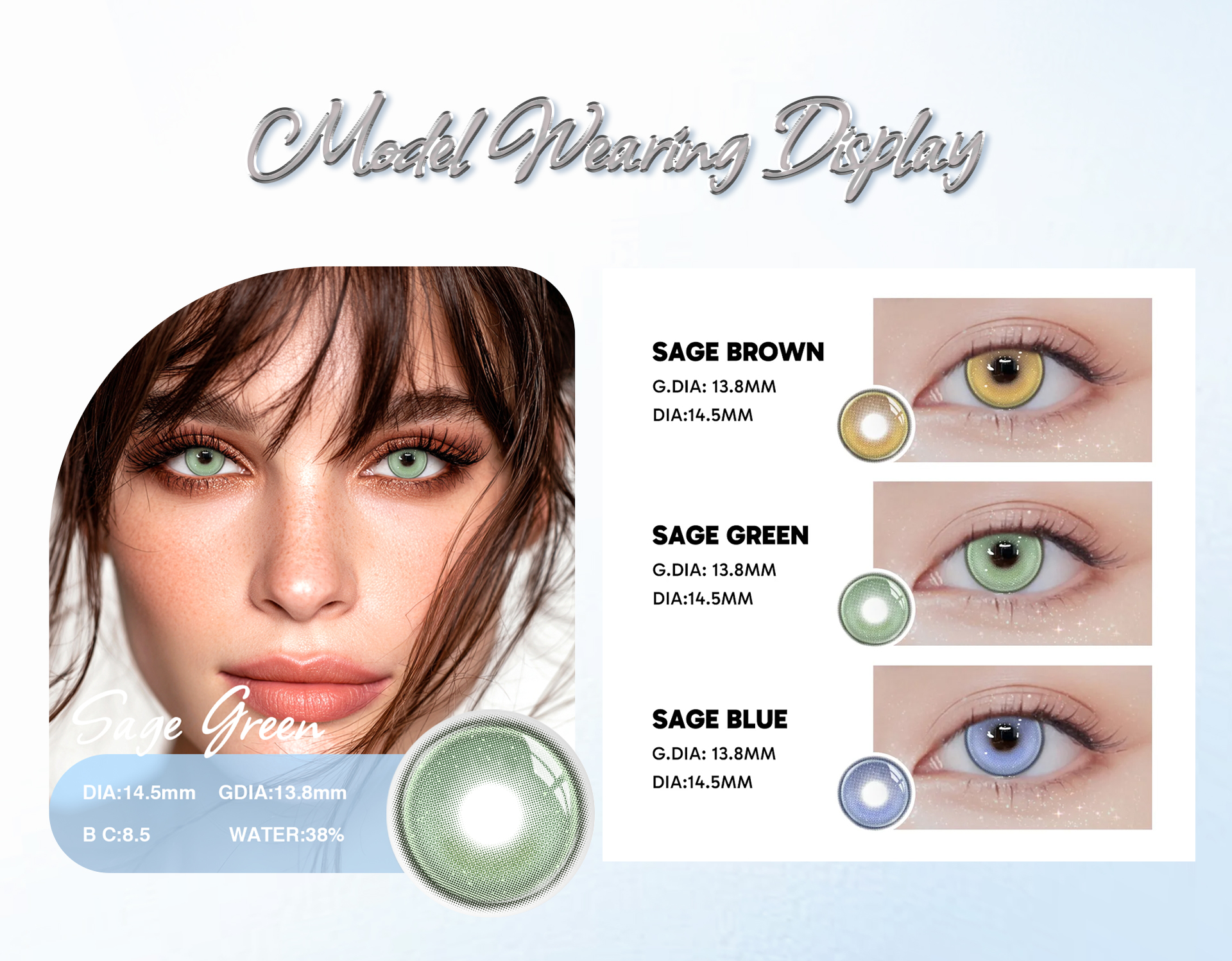 Sage Green contact lenses combine comfort, durability, and natural beauty. With 2 lenses per pack and a 1-year lifespan, they deliver a soft green hue and all-day comfort for effortless style.