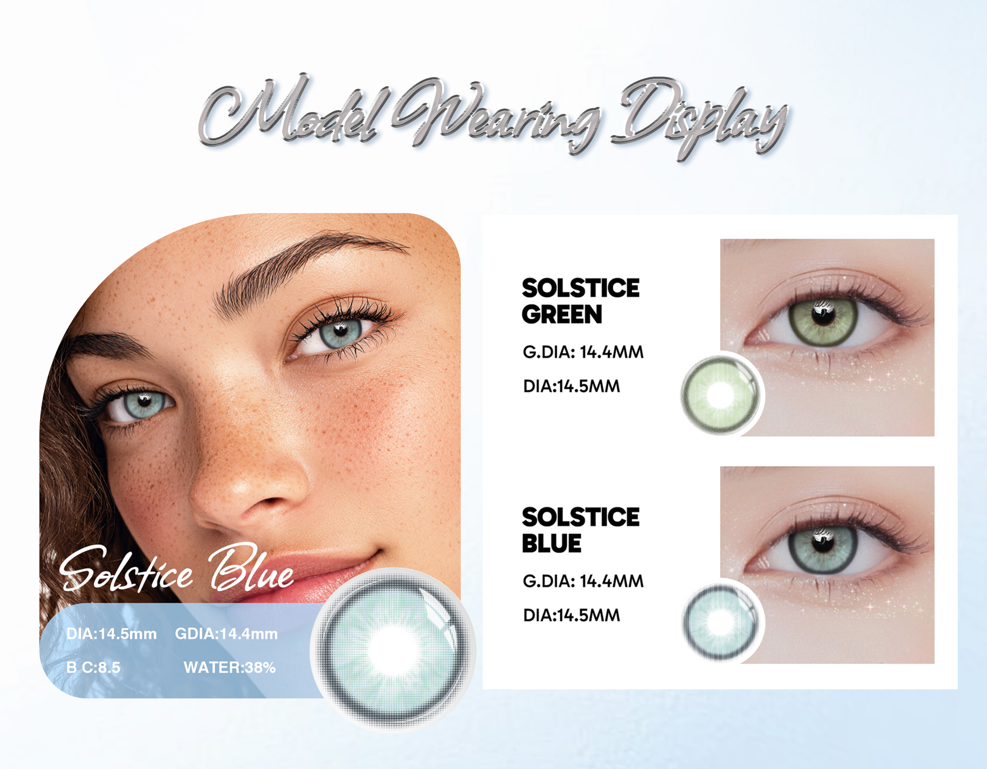 Solstice Blue Monthly Contact Lenses provide vibrant, natural-looking eyes with superior comfort and safety. Suitable for both prescription and non-prescription users, these FDA & CE certified lenses resist protein build-up and protect against UV and blue light, making them perfect for all-day wear.