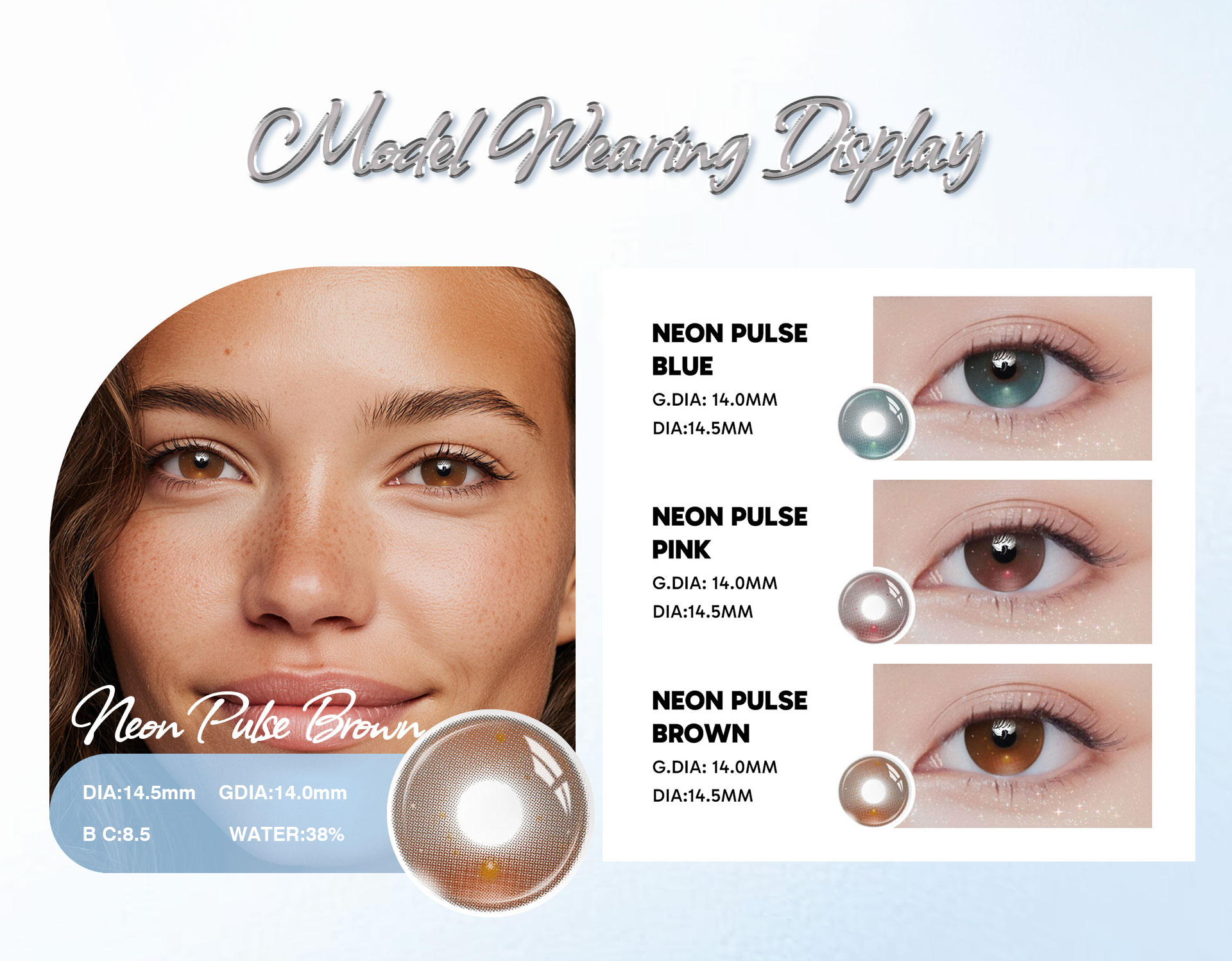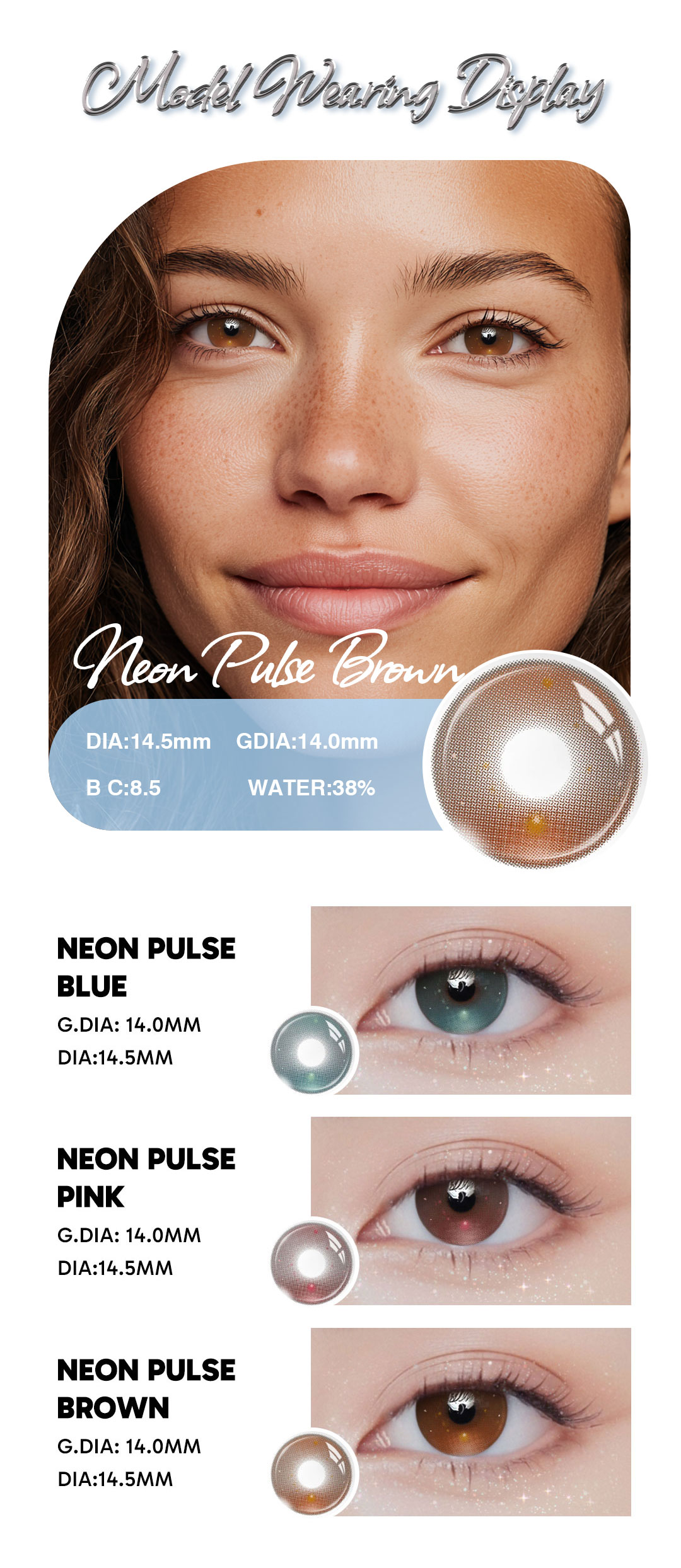 Neon Pulse Brown contact lenses – 1-year wear, FDA & CE certified, 14.5mm, Polyhema, prescription & non-prescription options, with UV and blue light protection.